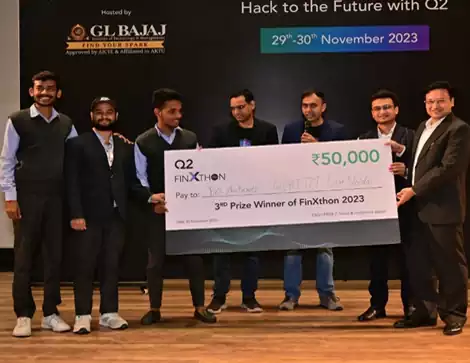 Apoorv Gupta and Aditya Chand (IT Department) secured 3rd position in the Fintech-themed "Q2 Finxthon – Break the Financial Pattern" Hackathon, held in November 2023. The event was organized by the Department of IT and T&P Cell, GLBITM, in collaboration with Q2 Software.
