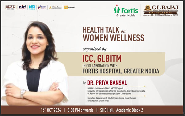 GL Bajaj ICC has organised an Health Talk on Women Wellness on 16 Oct 2024, 3:15 PM Onwards at SBG Hall, Academic Block 2, organized by the ICC GLBITM in collaboration with Fortis Hospital , Greater Noida as per following details