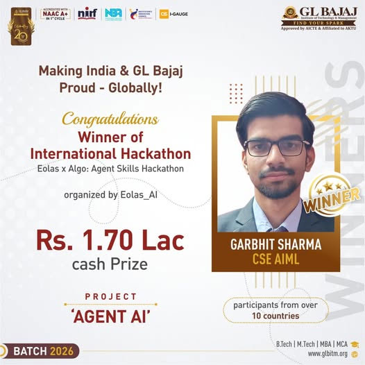 A massive shoutout and Congratulations to Garbhit Sharma of GL Bajaj Institute of Technology & Management (GLBITM) B.Tech CSE-AIML, Batch 2026 for emerging as the winner of the Eolas x Algo: Agent Skills Hackathon - an international AI event with participants from over 10 countries!