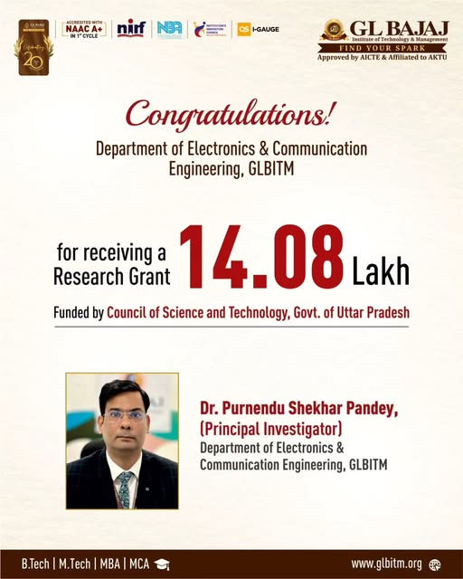 Proud to announce that the Department of Electronics & Communication Engineering (ECE), GL Bajaj Institute of Technology & Management has secured a prestigious Rs.14.08 Lakh Research Grant from the Council of Science & Technology, Uttar Pradesh (CSTUP).